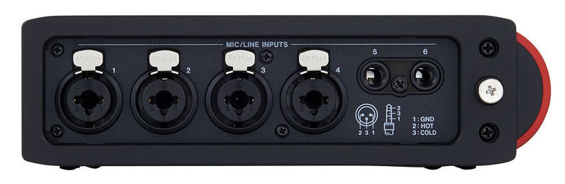 - 6 балансных микрофонных/линейных входов (четыре на разъёмах XLR + TRS и два на TRS) плюс двухканальный цифровой вход позволяют записывать одновременно до 8 дорожек в качестве 24 бит / 96 кГц;